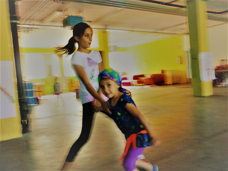 Foto: So kann sich auch ein Kreisel wild drehen😃 Bewegungs- & Tanzprojekt mit Flüchtlingsfamilien, Diakonie Salzburg 2017.